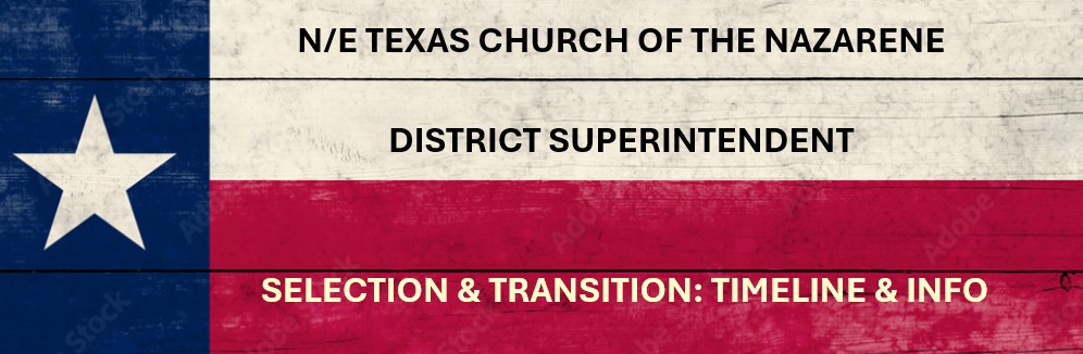 The District Advisory Committee has begun its search process for the next District Superintendent for the North/East Texas District Church of the Nazarene. Below you will find information intended to keep you well-informed throughout this process, the District Profile (prepared to aid in reaching that individual whom God has already anointed to fill the position), and the Nomination link. This page will be updated as more information becomes available.