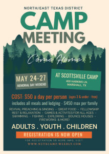 In an age of limited vacation time, relentless schedules, and an increasing disconnect from one another, we’d like to propose a truly Christian alternative… Consider bringing your family to the beautiful woodlands of east Texas, to the joyful fun, simple fellowship, and Spirit-filled worship found during Camp Meeting, which will occur over Memorial Day weekend – May 24th – 27th at Scottsville Camp.